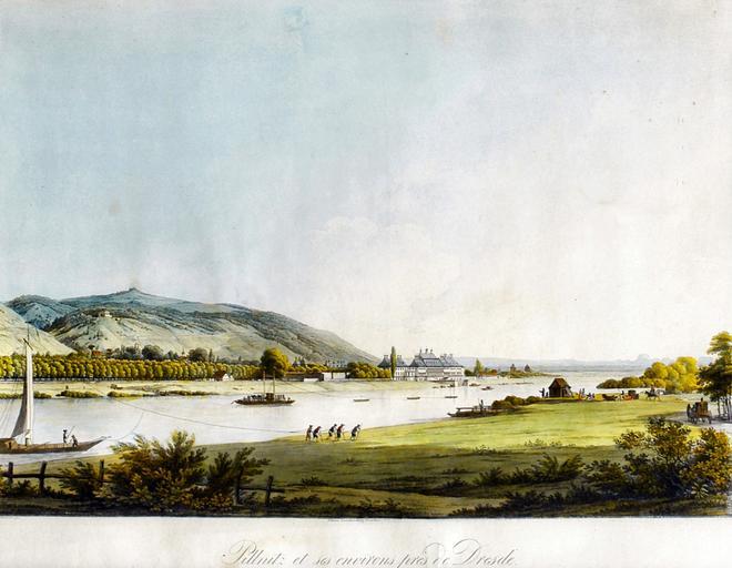 | Keywords: Hammer CG (C20)Pillnitz.jpg Bild-Beschreibung / description of picture 10 top right style background 87CEFF Titel / Title Wasserpalais Pillnitz - valign top right style background 87CEFF Beschreibung / Description Blick vom Kleinzschachwitzer Elbufer auf das Wasserpalais der Pillnitzer Schloßanlage südöstlich von Dresden Links im Bild das Schönfelder Hochland mit dem 384m hohen Triebenberg dem höchsten Berg Dresdens Im Hintergrund rechts die Tafelberge der Sächsischen Schweiz Lilienstein und Königstein Im Vordergrund links eine manuell betriebene Schleppseilfähre etwas flußaufwärts eine Gierseilfähre ähnlich wie sie noch heute auf der Elbe bei Rathen in Betrieb ist;<br/>alt-aquarellierter Umrissstich<br/>View from the left bank of Elbe-river to the Water palace of Pillnitz in the east of Dresden In the background left the Triebenberg the highest hill from Dresden In the right background the Elbe Sandstone Mountains Lilienstein and Königstein in Saxon Switzerland In foreground left a hand-operated cable ferry upstream a old reaction ferry;<br/>outline etching in old original color top right style background 87CEFF Autor / Artist gezeichnet und gestochen / painting and etching Christian Gottlob Hammer 1779-1864 top right style background 87CEFF Quelle / Source http //www saxonia com Galerie SAXONIA München; Objekt-Nr 006182 top right style background 87CEFF Datum / Date 1805 top right style background 87CEFF Lizenz / License PD-old Pillnitz Elbe in Dresden Dresden in art Christian Gottlob Hammer Images from Galerie Saxonia |