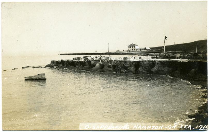 Keywords: Hampton on Sea 1911 125.jpg Postcard dated 1911 showing the back of Hernecliffe Gardens terrace after demolition and with its supporting cliff still in the process of sea erosion Photographed looking north-east The photographer was standing on the shore as it was then; the shore has moved southward since Some interesting points are 1 the length and structure of the old Hampton Pier now shortened which was blamed for precipitating the sea erosion; 2 a sailing ship behind the pier; 3 land not yet eroded between the Hernecliffe Gardens cliff and Hampton Pier Avenue; 4 no houses yet built on Westcliff it is now completely built up ; 5 in spite of the dereliction of this lost settlement there are still people walking about near the Hampton Inn Border The remaining border of this image is important for researchers of this photographer Some photographers trimmed their images more than others and Palmer has a reputation for producing smaller postcards than other early 20th century UK photographers He took his own photos developed them in-house onto postcard-backed photographic paper and trimmed them himself It is worth adding that during hand-developing the border is actively masked with equipment which both crops the picture and causes the white frame or border to appear on the paper This frame is part of the design and is one of the reasons why the quality of Palmer's work is so interesting and why there is an article and category for him on English Wiki Researchers need to see exactly where the edge of the postcard is This postcard has no white frame but the edge of the postcard is part of the composition Thank you for taking the time to read this Scan of postcard 1911 Anon although it could possibly be Fred C Palmer d 1930s because the date subject style and white writing are similar to his other work However Fred C Palmer's postcards usually had his name on the back and this one has no name out of copyright Other views of the same subject are File Hampton-on-Sea 1910 023 jpg and File Hampton on Sea 1910 124 jpg PD-old-70-1923 Hampton-on-Sea Erosion in the United Kingdom Disasters Buildings in Kent Fred C Palmer of Herne Bay 1911 in England |