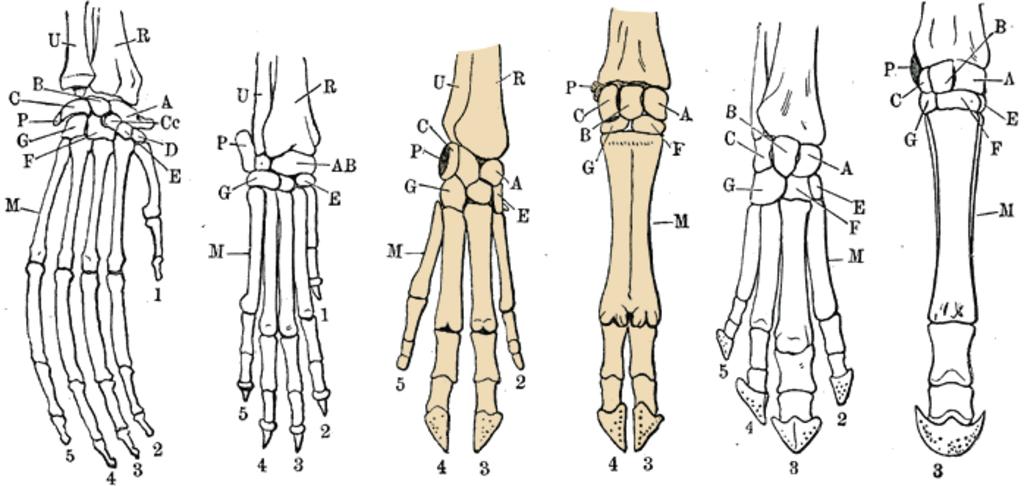 | Keywords: Hand skeletons with Artiodactyls highlighted.png en Figure from Meyers Lexicon Conversion 1888 “ Skeletons of mammalian hands Hands of even-toed ungulates are highlighted From left to right Orangutan; Dog; Swine; Cattle; Tapir; Horse Abbreviations R Radius; U Ulna; A-G Cc P carpals; A Scaphoideum; B lunar; C Triquetum ; D trapezium; E trapezoids; F Capitatum; G Hamatum; P Pisiform; Cc central carpal; M metacarpal; 1-5 thumb and digits two to five date File Handskelett MK1888 png Meyers Konversionlexikon 1888 other versions PD-old-70-1923 Mammal limb bones Homology Radius bone Phalanges Animal limb bone comparisons |