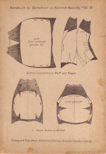 | Keywords: Handbuch Hanicke 78.jpg Graphics for Furriers Nutria Sumpfbiber zu Muff und Kragen kleine Nutria zu Mützen Handbuch für Kürschner von Heinrich Hanicke 1895 1895/2008 Heinrich Hanicke Author died more than 70 years ago - public domain PD-old Handbuch für Kürschner von Heinrich Hanicke 1895 Fur caps Muff manufacturing Nutria fur-skins Nutria clothing Nutria fur-skin manufacturing |
