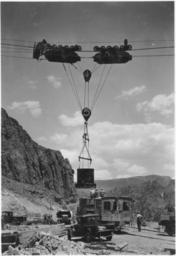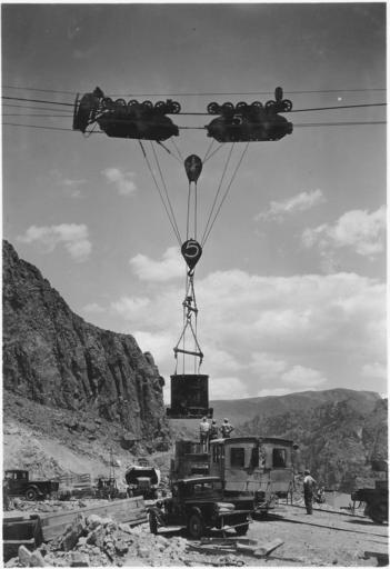 Keywords: Handling 8-cubic yard concrete bucket by overhead cableway for transport across canyon. Concrete being hauled into... - NARA - 293852.jpg Scope and content Photograph from Volume Two of a series of photo albums documenting the construction of Hoover Dam Boulder City Nevada General notes 293852 Local identifier Department of the Interior Bureau of Reclamation Engineering and Research Center 05/18/1981 - 03/04/1988 NARA's Rocky Mountain Region Denver NRGA Building 48 Denver Federal Center West 6th Avenue and Kipling Street Denver CO 80225-0307 1933-05-09 Record group Record Group 115 Records of the Bureau of Reclamation 1889 - 2008 Record group ARC 444 Photograph albums compiled 1903 - 1972 Series ARC 293611 File unit File unit ARC Variant control numbers NAIL Control Number NRG-115-CONSTPHO85006-BC21659 Other versions <gallery> File Handling_8-cubic_yard_concrete_bucket_by_overhead_cableway_for_transport_across_canyon _Concrete_being_hauled_into _-_NARA_-_293852 tif tif </gallery> NARA-cooperation PD-USGov Concrete buckets Cable cranes Six Companies Inc cableways at Hoover Dam construction site |