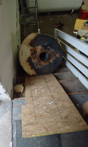 | Keywords: Handyman project to disassemble hot water heater 24.JPG en A flat board from the garage is put on the stairs to help the tank slide up Photo from a project to remove a bulky heavy non-needed 75 gallon hot water heater from a basement 2013-02-25 22 44 21 own Tomwsulcer cc-zero Uploaded with UploadWizard Water heating devices Handyman photos by tom sulcer Stairs | ||||