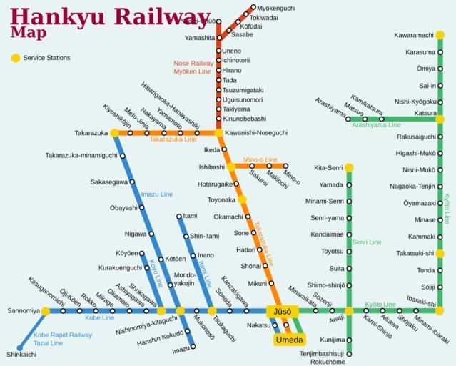 Keywords: Hankyu map.svg Map of major Hankyu rail lines including Nose Railway lines and Kobe Rapid Railway line 2007-02-21 own assumed El Cid Hankyu Railway Rail transport maps of Japan