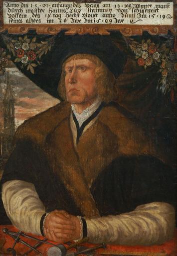 | Keywords: Hans Lutz 1509.jpg Hans Lutz Steinmetz aus Schussenried um 1473 in Schussenried 1525; kam 1499 als Parlier nach Bozen 1509 Oil on canvas Stadtmuseum Bozen cm 74 8 52 9 Anno die 1501 anfangen des Hans am 18 tag winter manst/ durch maister Hanns Lutz Stainmetz von Schussenriet/ vollent des 16 tag herbst Mon domini 1519/ seines alters im 36 Jar Im 1509 Jar caption upper center http //tirolerportraits it/ other versions PD-old-100 Stadtmuseum Bozen 1500s paintings in Italy 1509 portrait paintings Male 16th-century oil portraits of men at half length 1509 16th-century portrait paintings in Italy 1509 People of Bad Schussenried Flower garlands Fur garments in art Males with black headwear in art Masons in art Paintings with German inscriptions Paintings with years of production artist Paintings in the province of South Tyrol People of South Tyrol Portrait paintings with tools 1509 |