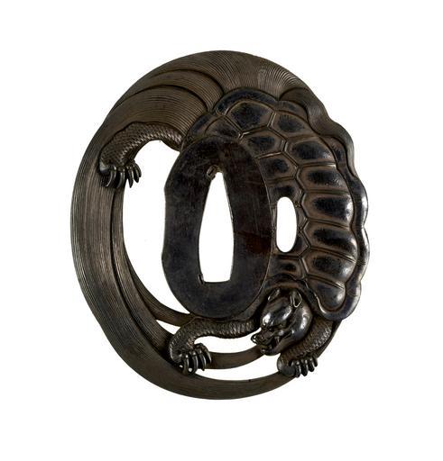 Keywords: Hara Kazutomo - Tsuba with a Long-lived Tortoise (Minogame) with a Tail of Seaweed - Walters 51384.jpg The turtle on this tsuba is a divine tortoise that can live one thousand years The tail is actually made of water plants that have grown in the tortoise's shell because it has lived so long This turtle is a symbol of longevity The right hand side of the tsuba is primarily the turtle's shell The tail sweeps around the left edge to meet to turtle's head at the lower right A space left between the tail and the central opening created the opening for the utility knife ca 1830 late Edo silver alloy cm 7 8 accession number 51 384 5373 Henry Walters Baltimore date and mode of acquisition unknown Walters Art Museum Henry Walters Acquired by Henry Walters Signature Kenkôsai Hara Kazutomo place of origin Edo present-day Tokyo Japan Walters Art Museum license Tsuba in the Walters Art Museum Media contributed by the Walters Art Museum needs category review Seaweed in art Hara Kazutomo Turtles in art Minogame |