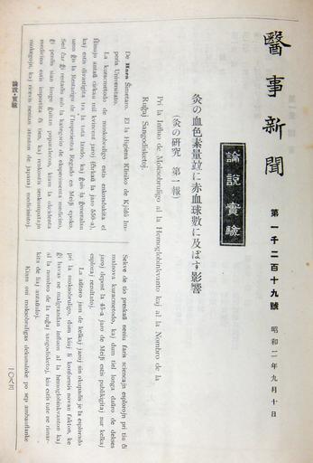 Keywords: Hara Shimetaro-Ijishimbun-1927.jpg en First page of Hara Shimetarō Effects of Moxa on hemoglobin and RBC count Iji Shinbun 1219 1927 Summary in Esperanto de First page of Hara Shimetarō Einfluss der Moxa auf die Hämoglobinmenge und Zahl der Erythrozythen Iji Shinbun 1219 1927 Zusammenfassung auf Esperanto own WolfgangMichel 2014-03-31 Moxibustion Medicine in Japan Cc-zero |