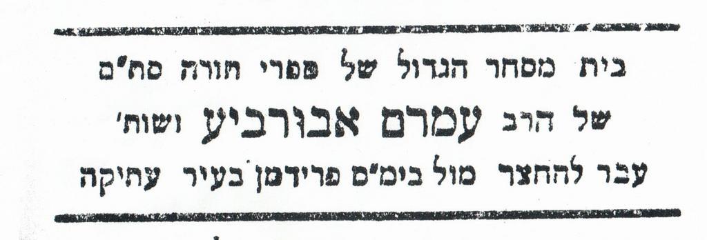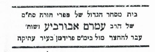 Keywords: HaRav Amram Aburbeh Beit Mischar in the Old city of Jerusalem ad in Geulah Calendar 1930.jpg en Rabbi Amram Aburbeh's big store for Torah scrolls Tefillin and Mezuzahs moved to the yard in front of Friedman store in the Old City of Jerusalem an ad in Geulah Calendar for 1930 by the editor L Shachor Eretz Israel he בית מסחר הגדו ש ספרי תורה סת ש הרב עמר אבורביע ושות עבר החצר מו בימ ס פרידמן בעיר עתיקה מודעה מתוך וח הגאו ה שנת 1930 העורך א יעזר שחור דפוס העברי ירוש 2013-09-22 06 06 42 own Alon Yeda cc-zero Uploaded with UploadWizard Advertisements Calendars Religious items store Old City Jerusalem |