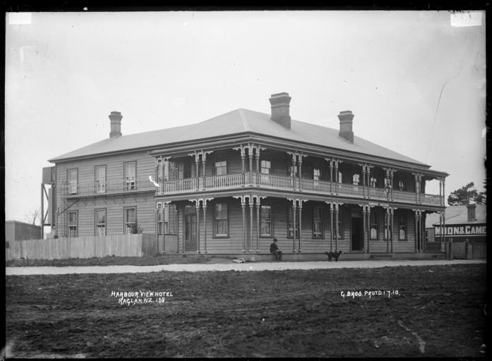 Keywords: blackandwhite monochrome outdoor architecture building photo border black and white View of The Harbour View Hotel, Raglan. A bearded man wearing a bowler hat is seated on the front step, and there is a dog nearby. Photographed in 1910, probably by Gilmour Brothers, Raglan (Robert Gilmour, proprietor). Inscriptions: Inscribed - Photographer's title on negative -bottom left: Harbour View Hotel, Raglan N.Z. 158bottom right: G Bros Protd 1.7.10. Quantity: 1 b&w original negative(s). Physical Description: Dry plate glass negative 4.5 x 6.5 inches Gilmour Brothers (Firm). Harbour View Hotel, Raglan, 1910 - Photograph taken by Gilmour Brothers. Price, William Archer, 1866-1948 :Collection of post card negatives. Ref: 1/2-000321-G. Alexander Turnbull Library, Wellington, New Zealand. natlib.govt.nz/records/23240056 View of The Harbour View Hotel, Raglan. A bearded man wearing a bowler hat is seated on the front step, and there is a dog nearby. Photographed in 1910, probably by Gilmour Brothers, Raglan (Robert Gilmour, proprietor). Inscriptions: Inscribed - Photographer's title on negative -bottom left: Harbour View Hotel, Raglan N.Z. 158bottom right: G Bros Protd 1.7.10. Quantity: 1 b&w original negative(s). Physical Description: Dry plate glass negative 4.5 x 6.5 inches Gilmour Brothers (Firm). Harbour View Hotel, Raglan, 1910 - Photograph taken by Gilmour Brothers. Price, William Archer, 1866-1948 :Collection of post card negatives. Ref: 1/2-000321-G. Alexander Turnbull Library, Wellington, New Zealand. natlib.govt.nz/records/23240056 |