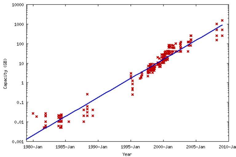 Keywords: Hard drive capacity over time.png Based on en Image KrydersLaw png WARNING This graph is highly misleading since it is based upon advertised retail products and at least in the 1980s misses the higher capacity drives which generally were not offered at retail For example the highest capacity disk drive listed and plotted for 1981 is 26MB while the actual highest capacity HDD then offered was the IBM 3380 at 2 520 MB per disk drive 2 HDAs per disk drive box By the late 90s high performance drives were readily available at retail Tom94022 <span class signature-talk >talk</span> 06 10 25 March 2009 UTC Current version including 2008 data Script and data to generate the plot below I donate this version including the 2008 data to the public domain Hankwang 17 00 2 March 2008 UTC Hard drive capacity over time svg <blockquote> Personal Computer hard disk drive capacity in gigabytes over time Data culled from http //www littletechshoppe com/ns1625/winchest html This is very much a first cut -- an improved image with more data extending further back in time would be much better than this The spreadsheet I used is available; leave me a message on my talk page </blockquote> User Omegatron/GIMP User Omegatron/License Computer science History of computing Hard disks Chronograms