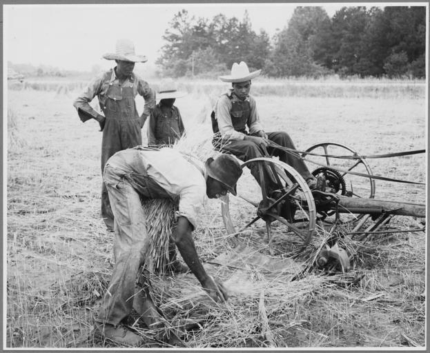 | Keywords: Harmony Community, Putnam County, Georgia.... Binders are not uncommon on large farms, but those who . . . - NARA - 521328.jpg Scope and content Full caption reads as follows Harmony Community Putnam County Georgia Binders are not uncommon on large farms but those who can handle all their small grains by hand continue to do so These African-American tenants have made a sort of mechanical cradle out of an old mowing machine with a piece of corrugated iron rigged behind the cutter bar to catch the fallen stalks One man walks along side with a stick and sweeps the standing grain back over the cutter while two others pick it out of the tin cradle and bind it General notes 521328 Local identifier 83-G-41015 Department of Agriculture Bureau of Agricultural Economics Division of Economic Information ca 1922 - ca 1953 NARA-Author Rusinow Irving Photographer 5307166 <br /> Still Picture Records Section Special Media Archives Services Division NWCS-S National Archives at College Park 8601 Adelphi Road College Park MD 20740-6001 1941 05 28 - 1941 06 01 Record group Record Group 83 Records of the Bureau of Agricultural Economics 1876 - 1959 Record group ARC 412 Photographic Prints Documenting Programs and Activities of the Bureau of Agricultural Economics and Predecessor Agencies compiled ca 1922 - ca 1947 documenting the period ca 1911 - ca 1947 Series ARC 521048 File unit File unit ARC Variant control numbers NAIL Control Number NWDNS-83-G-41015 Other versions <gallery> File Harmony_Community _Putnam_County _Georgia _Binders_are_not_uncommon_on_large_farms _but_those_who_ _ _ _-_NARA_-_521328 tif tif File Harmony_Community _Putnam_County _Georgia _Binders_are_not_uncommon_on_large_farms _but_those_who_ _ _ _-_NARA_-_521328 jpg jpg </gallery> NARA-cooperation PD-USGov Irving Rusinow Putnam County Georgia |