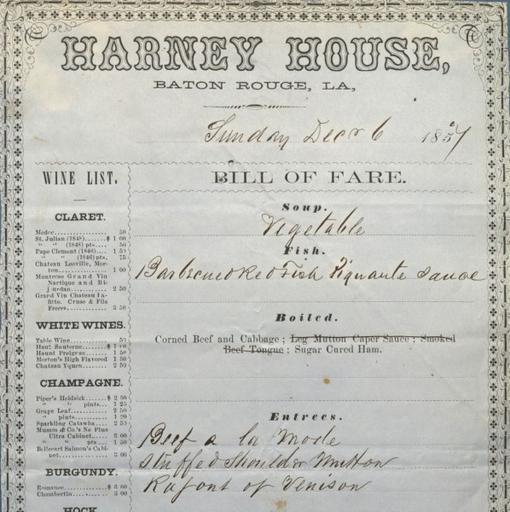 | Keywords: Harney House restaurant menu (December 6, 1857).jpg en Harney House Baton Rouge 1857 Bill of Fare Menus from hotels restaurants and steamboats in the 1850s and 60s The name WM J RHODUS Proprietor is prominently displayed at the bottom of this menu http //digital lib uh edu/u /p15195coll34 148 Hospitality Industry Archives 1857-12-06 This image is in the public domain and may be used freely If publishing in print electronically or on a website please use the citation Courtesy of Special Collections University of Houston Libraries To order a higher resolution reproduction see http //info lib uh edu/about/campus-libraries-collections/special-collections-archives/request-digital University of Houston Libraries Food menus Hotels in Baton Rouge Restaurants in Baton Rouge 1857 in Louisiana Baton Rouge in the 1850s FAL |