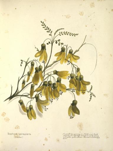 Keywords: artist:name=emily cumming harris artist:name=emilycummingharris taxonomy:binomial=sophora tetraptera taxonomy:binomial=sophoratetraptera taxonomy:common=kowhai artist:viaf=9793637 drawing A branch showing leaves and flowers of kowhai Quantity: 1 colour art print(s). Physical Description: Lithograph, hand-coloured, 305 x 245 mm Harris, Emily Cumming, 1836?-1925. Harris, Emily Cumming, 1837?-1925 :Sophora tetraptera (kowhai). A small tree growing in North and South Islands. It is thickly covered in early spring with golden yellow flowers. The wood is exceedingly hard. [1899?]. Ref: PUBL-0024-1-05. Alexander Turnbull Library, Wellington, New Zealand. natlib.govt.nz/records/22876706 A branch showing leaves and flowers of kowhai Quantity: 1 colour art print(s). Physical Description: Lithograph, hand-coloured, 305 x 245 mm Harris, Emily Cumming, 1836?-1925. Harris, Emily Cumming, 1837?-1925 :Sophora tetraptera (kowhai). A small tree growing in North and South Islands. It is thickly covered in early spring with golden yellow flowers. The wood is exceedingly hard. [1899?]. Ref: PUBL-0024-1-05. Alexander Turnbull Library, Wellington, New Zealand. natlib.govt.nz/records/22876706 |