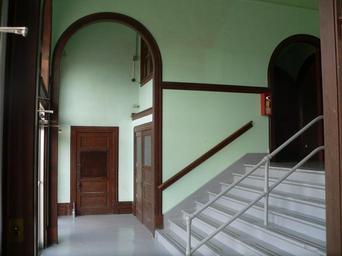 Keywords: Hartington auditorium lower lobby 05 face N.JPG Hartington Nebraska entrance lobby facing north The west exterior doors are barely visible at the left edge of the photo The door in the center was locked The double doors obliquely visible behind the stairs apparently lead down to the building's lower level although they may not be in current use The arched doorway at upper right leads to a hallway; turning left in that hallway leads to a stairway that runs first west then east to a locked door apparently leading to a room above the lobby; daylight was visible under the door suggesting that the room has exterior windows own Ammodramus 2010-11-01 Pictures by Ammodramus Taken with Panasonic Lumix DMC-FZ20 Staircases Semi-circular arches Hartington Nebraska city auditorium |