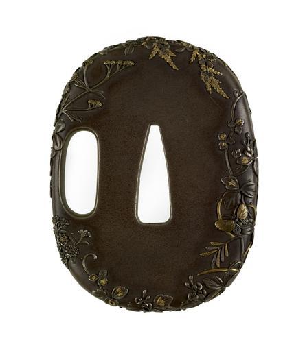 Keywords: Hashimoto Isshi I - Tsuba with Autumn Grasses with Spider and Butterflies - Walters 51401.jpg On the front of this tsuba are various autumn flowers including chrysanthemums maiden flower arrowroot and pampas grass On the reverse is a spider in a web in the upper left Butterflies are on the edge at the right and top between 1850 1871 late Edo-Meiji shibuichi gilt cm 5 accession number 51 401 29273 Henry Walters Baltimore date and mode of acquisiton unknown Walters Art Museum Henry Walters Acquired by Henry Walters Signature Hashimoto/Isshi kao place of origin Edo present-day Tokyo Japan Walters Art Museum license Tsuba in the Walters Art Museum Hashimoto Isshi I Media contributed by the Walters Art Museum needs category review |