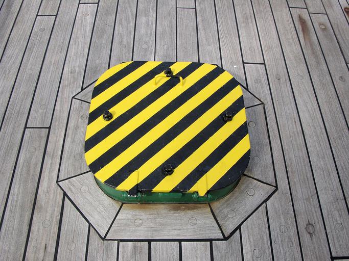 Keywords: hatch deck ship vessel danger wood decking yellow black warning wooden planks maritime shipping industrial transportation