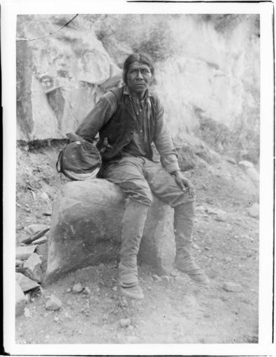 | Keywords: Havasupai Indian man, Waluthama, sitting on a rock, ca.1899 (CHS-3779).jpg en <br> Havasupai Indian man Waluthama sitting on a rock ca 1899 Photograph of a Havasupai Indian man Waluthama sitting on a rock ca 1899 He wears a dark vest over a dark shirt with trousers and moccasins and leggings He holds a canteen by his right hand on the rock His long dark hair is parted in the middle and drawn towards the back of his head The rocky vertical canyon wall is visible close behind him Call number CHS-3779 Photographer James George Wharton Filename CHS-3779 Coverage date circa 1899 Part of collection California Historical Society Collection 1860-1960 Type images Part of subcollection Title Insurance and Trust and C C Pierce Photography Collection 1860-1960 Repository name USC Libraries Special Collections Format glass plate negatives Microfiche number 1-167- Archival file chs_Volume95/CHS-3779 tiff Repository address Doheny Memorial Library Los Angeles CA 90089-0189 Geographic subject country USA Format aacr2 2 photographs glass photonegative photoprint b w ; 22 x 17 cm Rights Digitally reproduced by the USC Digital Library; From the California Historical Society Collection at the University of Southern California Subject adlf tribal areas Project USC Accession number 3779 Repository email specol usc edu Contributing entity California Historical Society Date created circa 1899 Publisher of the digital version University of Southern California Libraries Format aat photographic prints; photographs Legacy record ID chs-m16364; USC-1-1-1-13517 Access conditions Send requests to address or e-mail given Phone 213 821-2366; fax 213 740-2343 Subject file heading Indians -- Havasupai Subject lcsh Indians of North America; Havasupai Indians; Men; Rocks; Clothing and dress Subject Havasupai Indians circa 1899 date created James George Wharton http //digitallibrary usc edu/cdm/ref/collection/p15799coll65/id/16303 PD-old-70-1923 Images from USC Digital Library uploaded by Fæ California Historical Society Collection 1860-1960 Glass plate negatives Havasupai Photographs by George Wharton James |