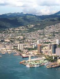Keywords: hawaii oahu aerial view city beach hawaii beach travel vacation outdoor summer blue sand tropical ocean honolulu outside mountains skyscrapers architecture