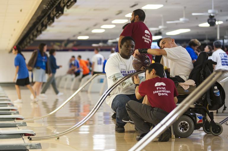 | Keywords: Hawaii Special Olympics 141122-N-QG393-030.jpg en Spc Jamaal Jacobs assigned to 3-25th Echo Company Aviation Battalion at Wheeler Army Airfield assists an athlete during a game of bowling as a part of the Special Olympics held on Joint Base Pearl Harbor-Hickam The Special Olympics LLC is a nonprofit group established in 1968 to provide year-round sports training and athletic competition in a variety of Olympic-type sports for children and adults with intellectual disabilities giving them continuing opportunities to develop physical fitness demonstrate courage experience joy and participate in a sharing of gifts skills and friendship with their families other Special Olympics athletes and the community U S Navy photo by Mass Communication Specialist 2nd Class Tiarra Fulgham/Released 2014-11-22 Petty Officer 2nd Class Tiarra Fulgham https //www dvidshub net/image/1717143 141122-N-QG393-030 2015-01-09 12 02 PEARL HARBOR HI US PD-USGov-Military-Navy 2014 in Pearl Harbor Sports at Pearl Harbor Special Olympics Images from DoD uploaded by Fæ |