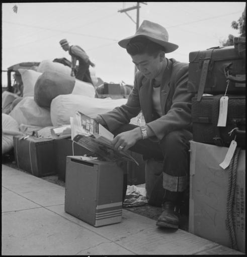 | Keywords: Hayward, California. Eddie Nomura, president of the senior class in the Hayward High School, reads . . . - NARA - 537517.jpg Scope and content The full caption for this photograph reads Hayward California Eddie Nomura president of the senior class in the Hayward High School reads magazine article The Date of Hitler's Fall as he awaits evacuation bus Evacuees of Japanese ancestry will be housed in War Relocation Authority centers for the duration General notes 537517 Local identifier 210-G-C167 Department of the Interior War Relocation Authority 02/16/1944 - 06/30/1946 NARA-Author Lange Dorothea 1895-1965 Photographer 1372774 <br /> Still Picture Records Section Special Media Archives Services Division NWCS-S National Archives at College Park 8601 Adelphi Road College Park MD 20740-6001 1997-05-08 Record group Record Group 210 Records of the War Relocation Authority 1941 - 1989 Record group ARC 537 Central Photographic File of the War Relocation Authority compiled 1942 - 1945 Series ARC 536000 File unit File unit ARC Variant control numbers NAIL Control Number NWDNS-210-G-C167 Other versions <gallery> File Hayward _California _Eddie_Nomura _president_of_the_senior_class_in_the_Hayward_High_School _reads_ _ _ _-_NARA_-_537517 tif tif File Hayward _California _Eddie_Nomura _president_of_the_senior_class_in_the_Hayward_High_School _reads_ _ _ _-_NARA_-_537517 jpg jpg </gallery> NARA-cooperation PD-USGov Dorothea Lange Japanese American internment processing in Hayward 1942 in California People of Hayward California Adolescent boys in the United States High school students in the United States Reading boys Students in California Boys wearing hats |