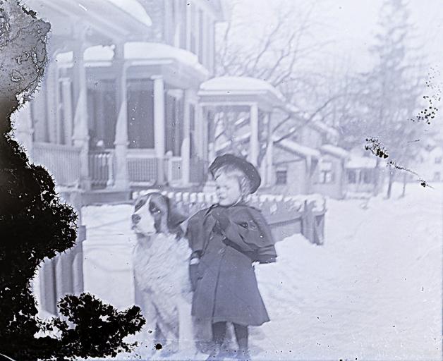 Keywords: 1890s children dogs winter clothes snow Small child standing next to a St. Bernard dog. One of a set of glass negatives associated with Herbert 'Burt' Rathbun (1861-1897). The negative is slightly damaged. Small child standing next to a St. Bernard dog. One of a set of glass negatives associated with Herbert 'Burt' Rathbun (1861-1897). The negative is slightly damaged.
