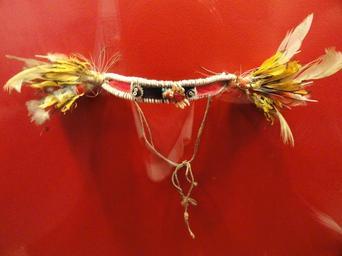 Keywords: Head band, pandanus leaf, nassa shells, feathers, cuscus teeth, cloth, pearl shell, Tolai, 1890 - Staatlichen Museums für Völkerkunde München - DSC08314.JPG en Exhibit in the Oceanic collection of the Staatlichen Museums für Völkerkunde München Maximilianstraße 42 Munich Germany Head band made of pandanus leaf nassa shells feathers cuscus teeth cuscus a group of Australasian possums cloth pearl shell Tolai people East New Britain Provence Papua New Guinea 1890 Tolai-Volk Gazelle-Halbinsel von Neubritannien Papua-Neuguinea <br /> Traditionelles Kopfband Pandanus-Blätter Nassa-Schneckenschalen Federn Cuscus-Zähne Cuscus sind den Possums ähnliche Beutelsäuger Stoff Perlenmuscheln um 1900; Dauerausstellung Ozeanien des Staatlichen Museums für Völkerkunde in München I took this photograph 2011-05-03 03 54 05 Daderot Public domain Tolai Dauerausstellung Ozeanien des Staatlichen Museums für Völkerkunde München |
