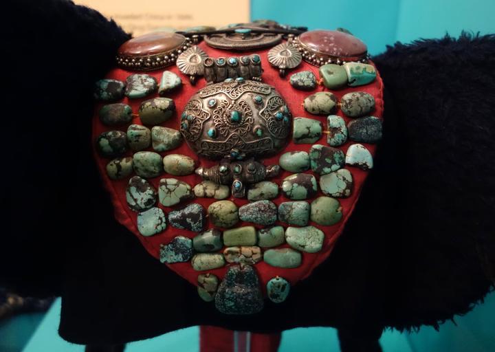 | Keywords: Headdress, Ladakh, India, 20th century, wool, cotton, turquoise, silver, carnelian - Fernbank Museum of Natural History - DSC09983.JPG en Exhibit in the Fernbank Museum of Natural History Atlanta Georgia USA Photography was permitted in the museum without restriction 2012-03-17 00 40 20 own Daderot cc-zero Ethnographic items in the Fernbank Museum of Natural History Uploaded with UploadWizard Jewellery of Ladakh | ||||