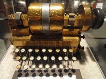 Keywords: Hebern Electric Code Machine, c. 1918, a single rotor machine made by Edward H. Hebern - National Cryptologic Museum - DSC07686.JPG en Exhibit in the National Cryptologic Museum Fort Meade Maryland USA All items in this museum are unclassified; items created by the United States Government are not subject to copyright restrictions 2013-03-29 09 55 32 own Daderot cc-zero Uploaded with UploadWizard Rotor machines in the National Cryptologic Museum |