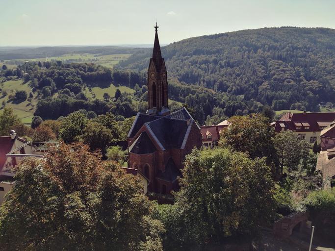 Keywords: heidelberg dilsberg church sun landscape nature village away out beautiful quiet hiking get out off the beaten track forest neckar homes mountains autumn october green wide distant valley