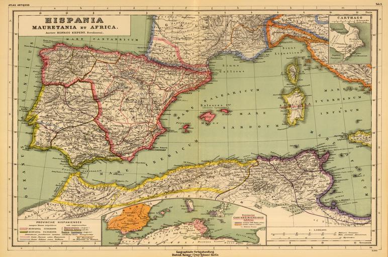 Keywords: Heinrich Kiepert. Hispania, Mauretania et Africa.jpg Hispania Mauretania et Africa with Carthago with Provinciae Carthaginiensibus subditae Auctore Henrico Kiepert Berolinensi Geographische Verlagshandlung Dietrich Reimer Ernst Vohsen Berlin Wilhemlstr 29 X 1901 1903 http //www davidrumsey com/ 1903 Creator Heinrich Kiepert PD-old-100 Atlas antiquus by Heinrich Kiepert David Rumsey Historical Map Collection Old maps of Spain Old maps of Tunisia Old maps of Algeria Old maps of Morroco Old maps of Africa
