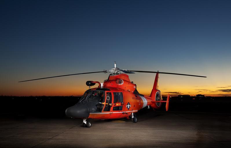Keywords: helicopter mh-65 dolphin search and rescue sar twin-engine single main rotor coast guard usa ground sunset dusk twilight evening parked military sky mission chopper copter