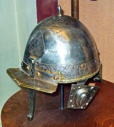 Keywords: Helm TGIM.jpg ru Шлем с а сенальным клеймом и деко ативной надписью Ту ция XV-XVI век Сталь; ковка г ави овка и золочение own Лапоть 2010 Armour in the Moscow State Historical Museum Chichak