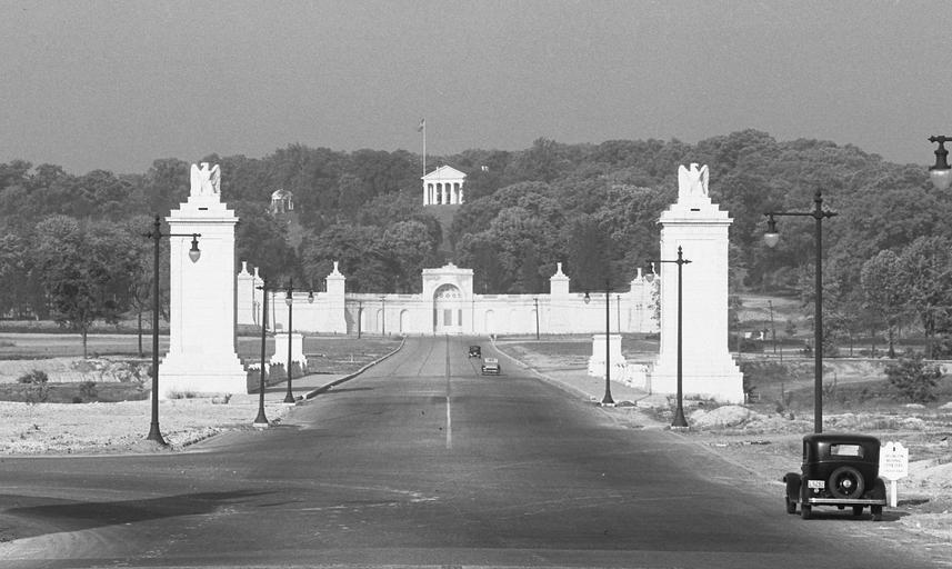 | Keywords: Hemicycle - Arlington House - Temple of Fame - Memorial Drive - Arlington National Cemetery - 1930s.jpg en Standing on Columbia Island in the Potomac River facing west across the Boundary Channel Bridge and down Memorial Drive to Arlington National Cemetery in Arlington County Virginia in the United States The Hemicycle the ceremonial entrance to the cemetery can be seen at the end of the road Arlington House the Robert E Lee National Memorial is visible on the hill above The road turning to the left leads to the Mount Vernon Memorial Parkway now known as the George Washington Memorial Parkway Behind the camera is Arlington Memorial Bridge This image was taken after 1932 when the Boundary Channel Bridge and Memorial Drive were completed but before September 1940 when a major traffic circle was added to Columbia Island between the memorial columns http //www loc gov/pictures/item/thc1995004015/PP/ Theodor Horydczak after 1933 and before September 1940 File Looking W across Columbia Island down Memorial Drive at Arlington National Cemetery - 1930s jpg Derivative file PD-USGov Women in Military Service for America Memorial Robert E Lee National Memorial Arlington National Cemetery Main Gates Former memorials at Arlington National Cemetery |