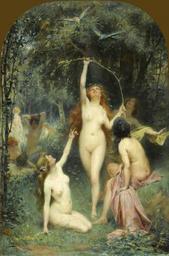 | Keywords: Henri Adrien Tanoux - Nymphs In A Forest.jpg Artwork Creator Henri Adrien Tanoux 1898 Oil on Canvas Size cm 48 2 73 private collection object history Sold for US 11 250 ‚¬10 438 1 Nov 2012 New York Lot 51 exhibition history credit line place of creation Tanoux - 1898 lower left signature and date http //www bonhams com/auctions/20062/lot/51/ accession number PD-old-auto-1923 1923 Paintings of nymphs People in forests in art Nude women with red hair in art Paintings of women with blond hair Paintings of women with long hair Paintings of females with black hair Paintings of nude women standing outdoors Paintings of nude women sitting outdoors Nude or partially nude women with birds in art Nude females featuring armpits in art 1898 oil on canvas paintings Henri Adrien Tanoux Images from Bonhams |