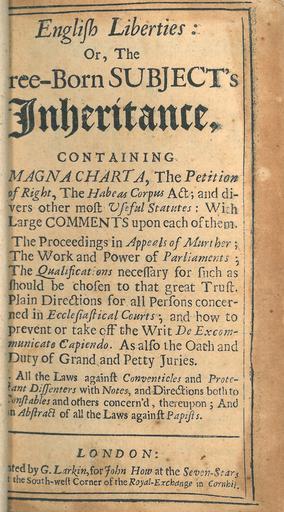 | Keywords: Henry Care, English Liberties (1st ed, 1682?, title page).jpg Title page of cite book Henry Care w Henry Care English Liberties Or The Free-born Subject ™s Inheritance Containing I Magna Charta the Petition of Right the Habeas Corpus Act; and Divers other Most Useful Statutes With Large Comments upon Each of Them II The Proceedings in Appeals of Murther; the Work and Power of Parliaments; the Qualifications Necessary for Such as should be Chosen to that Great Trust Plain Directions for all Persons Concerned in Ecclesiastical Courts; and How to Prevent or Take Off the Writ De Excommunicato Capiendo As also the Oath and Duty of Grand and Petty Juries III All the Laws against Conventicles and Protestant Dissenters with Notes and Directions both to Constables and Others Concern ™d thereupon; and an Abstract of all the Laws against Papists London Printed by George Larkin for John How at the Seven-Stars at the South-west Corner of the Royal-Exchange in Cornhil 1682 701822788 Scanned from the original 1682 Henry Care 1646 “1688 Other versions PD-old-100-1923 1682 books Books about the constitutional law of England and Wales Human rights law of England and Wales Title pages from England Henry Care, English Liberties (1st ed, 1682?, title page).jpg Title page of cite book Henry Care w Henry Care English Liberties Or The Free-born Subject ™s Inheritance Containing I Magna Charta the Petition of Right the Habeas Corpus Act; and Divers other Most Useful Statutes With Large Comments upon Each of Them II The Proceedings in Appeals of Murther; the Work and Power of Parliaments; the Qualifications Necessary for Such as should be Chosen to that Great Trust Plain Directions for all Persons Concerned in Ecclesiastical Courts; and How to Prevent or Take Off the Writ De Excommunicato Capiendo As also the Oath and Duty of Grand and Petty Juries III All the Laws against Conventicles and Protestant Dissenters with Notes and Directions both to Constables and Others Concern ™d thereupon; and an Abstract of all the Laws against Papists London Printed by George Larkin for John How at the Seven-Stars at the South-west Corner of the Royal-Exchange in Cornhil 1682 701822788 Scanned from the original 1682 Henry Care 1646 “1688 Other versions PD-old-100-1923 1682 books Books about the constitutional law of England and Wales Human rights law of England and Wales Title pages from England |