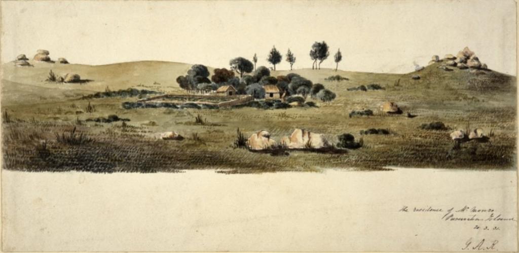 | Keywords: Henry Laing Establishment of James Munro.jpg en Henry Laing A view in Tasmania - Preservation Island off SW corner of Cape Barren Island; view of the establishment of James Munro in centre on broad plain surrounded by cluster of trees 1831 Pen and grey ink and watercolour John Lort Stokes Discoveries in Australia Volume 2 Chapter 13 London 1846 I found Preservation Island inhabited by an old sealer of the name of James Monro generally known as the King of the Eastern Straitsmen Another man and three or four native women completed the settlement if such a term may be applied They lived in a few rude huts on a bleak flat with scarce a tree near but sheltered from the west by some low granite hills; a number of dogs goats and fowls constituted their livestock In this desolate place Monro had been for upwards of twenty-three years; and many others have lived in similar situations an equally long period It is astonishing what a charm such a wild mode of existence possesses for these men whom no consideration could induce to abandon their free though laborious and somewhat lawless state British Museum Henry Laing 1831 PD-old Watercolor paintings of landscapes Islands of Tasmania |