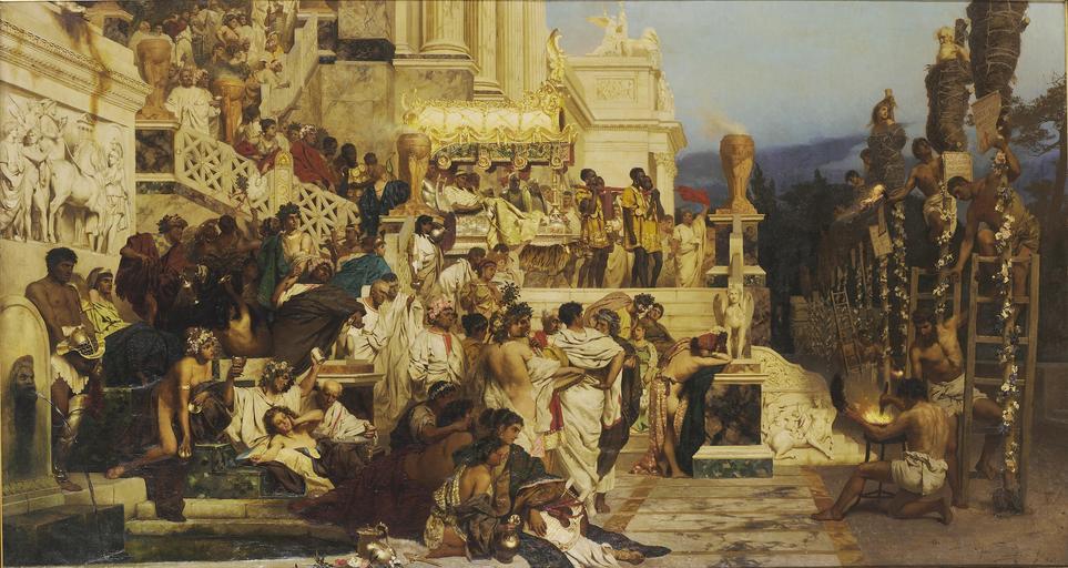 | Keywords: Henryk Siemiradzki - Pochodnie Nerona.jpg artwork creator Henryk Siemiradzki Pochodnie Nerona Светочи х истианства Факелы е она Світочі х истиянства 1882 oil canvas cm 94 174 5 object history Provenance Acquired from the artist presumably in Rome by von Botkinen later the Russian Cultural Attaché for the Tsar in Berlin Brought to Moscow where it hung in von Botkinen's residential palace Taken to Berlin at the beginning of the World War I upon his appointment as Cultural Attaché; Sold by von Botkinen in Berlin in 1921 for the equivalent of 80 000 Danish crowns to C C Christensen owner and director of the old Victoria Theatre in Copenhagen; Collection of C C Christensen Frederiksberg Copenhagen Denmark; Sold in Copenhagen in November 1940; Private collection Denmark credit line signed 'H Siemiradzki Roma 1882' lower right accession number http //www bonhams com/auctions/10810/lot/44/ Bonhams http //images1 bonhams com/image src Images/live/2004-01/20/6604677-1-5 jpg Detail http //images1 bonhams com/image src Images/live/2004-01/20/6604677-1-6 jpg Detail PD-old-100 Nero's torches by Henryk Siemiradzki 1882 oil on canvas paintings Images from Bonhams 1880s paintings in private collections Paintings with years of production artist Paintings with signatures lower right Paintings in Denmark |