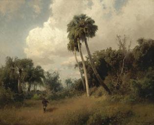 Keywords: hermann herzog landscape painting art artistic artistry oil on canvas sky clouds trees nature outside scenic country countryside forest woods man hunter palms palm trees