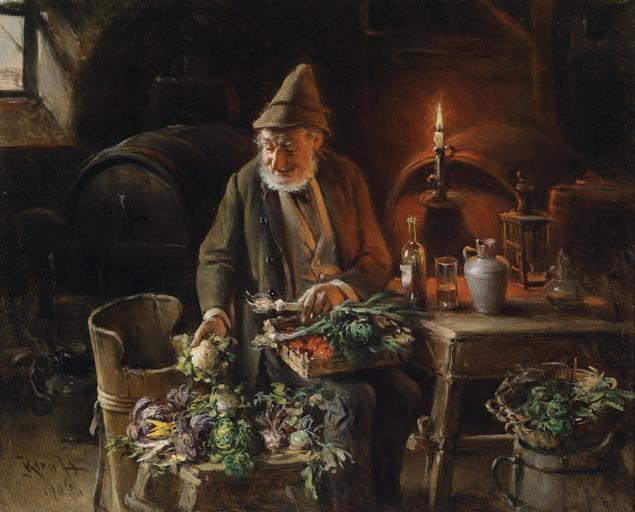 Keywords: Hermann Kern Gemüsehändler im Weinkeller 1906.jpg Artwork creator Hermann Kern by 1906 oil canvas cm 43 52 5 object history exhibition history credit line Kern H 1906 signature/date accession number http //www dorotheum com Dorotheum PD-old-100 Images from Dorotheum Hermann Kern 1906 paintings Paintings of vegetables Wine cellars |