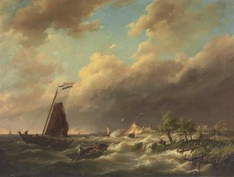 Keywords: Hermanus Koekkoek (sr.) - Stormy coastal scene with town beyond.jpg Artwork Creator Hermanus Koekkoek sr oil on canvas cm 63 5 84 accession number object history with Frost Reed London <br/>Acquired from the above by the family of the present owner credit line 'H Koekkoek' ~ lower left signature 2010 07 07 PD-old-100-1923 1882 Hermanus Koekkoek sr Oil paintings of seascapes 19th-century sailing ships in paintings 19th-century paintings location missing |