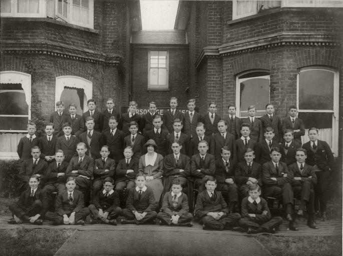 | Keywords: Herne Bay College 1925.jpg  Group portrait of pupils aged perhaps 13-18yrs at Parsonage House Herne Bay College Herne Bay Kent England The lady in the photograph could be the Matron The portrait is roughly A4 size mounted on a large card At the top of the card it says Herne Bay College with the coat of arms showing the Kentish white horse symbol the Herne Bay heron symbol and an open book On the card mount below the photo it says Parsonage House autumn 1925 The photographer has written in pencil Tower Studio Herne Bay This is the photographer who took over the studio from Fred C Palmer after 1922 Scan of original photograph in my possession 1925 Tower Studios Herne Bay; individual author is anonymous out of copyright PD-old-70 Historical images of Eddington Kent Schools in Kent |