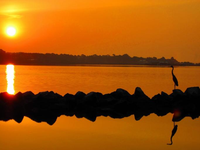 Keywords: heron florida bird wildlife nature water sunset sunrise red orange jetty rocks peaceful reflection