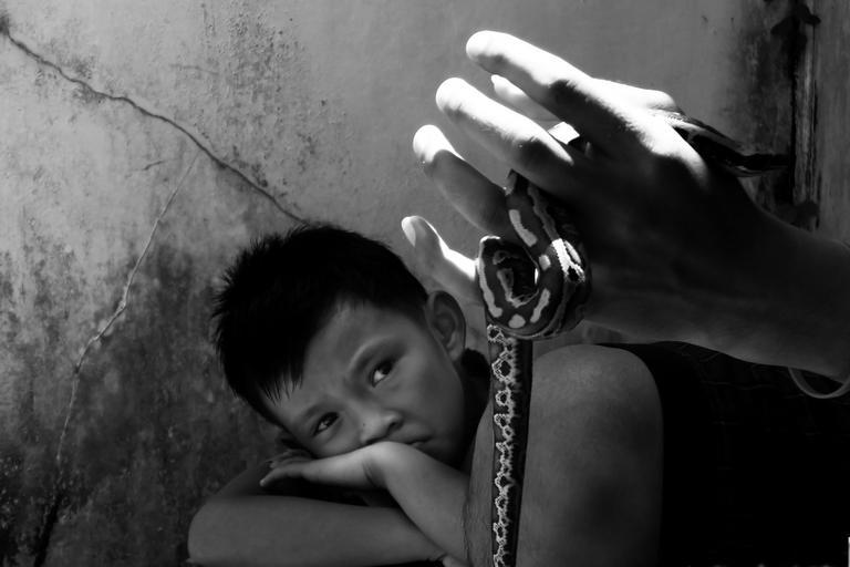 Keywords: herpetophobia children boy young kid black white snake phyton