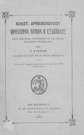 | Keywords: Hexabiblos - Constantine Harmenopoulos - 1872 - Athina - first page.jpg  en Front page of the Procheiron or Hexabiblos of Constantine Harmenopoulos 1320 - 1380/1385 Athens 1872 edition by Z Noutsis modern Greek translation Hexabiblos was a Byzantine legal treatise of the 14th century that continued to be widely used in the Balkan lands throughout the later Ottoman Empire's presence At 1828 it was adopted by the newly founded Greek state as the state's civic code where it remained so until 1946 el Η αρχική σελίδα της του Προχείρου ή Εξάβιβλου του Κωνσταντίνου Αρμενό ουλου 1320 - 1380/1385 έκδοση του 1872 στην Αθήνα α ό τον Ζ  ούτση μετάφραση στα νέα ελληνικά Η Εξάβιβλος ήταν μια Βυζαντινή νομική  ραγματεία η ο οία συνέχισε να χρησιμο οιείται ευρέως στα Βαλκάνια κατά τη διάρκεια της μετέ ειτα Οθωμανικής αυτοκρατορίας Το 1828 το έργο αυτό υιοθετήθηκε ως ο νομικός κώδικας του νεοιδρυθέντος Ελληνικού κράτους ό ου και  αρέμεινε σε ισχύ ως το 1946 1872 http //anemi lib uoc gr/search/ search_type simple display_mode overview stored_cclquery creator 28 CE 91 CF 81 CE BC CE B5 CE BD CF 8C CF 80 CE BF CF 85 CE BB CE BF CF 82 20 CE 9A CF 89 CE BD CF 83 CF 84 CE B1 CE BD CF 84 CE AF CE BD CE BF CF 82 29 rss 0 number 10 keep_number 10 offset 1 Constantine Harmenopoulos original Z Noutsis translator/editor other versions Athens Greece Custom license marker 2015 02 14 PD-old-70-1923 Byzantine writers Law books Books in Greek Uploaded with UploadWizard |
