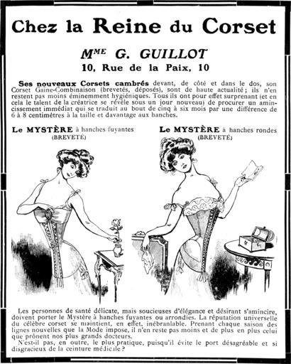 | Keywords: Hez laReine duCorsetMneGGuillotFemina1906.png Hez la Reine du Corset Mne G Guillot Femina; page XIII 1906; 15 Octobre; PD Chez la Reine du Corset MME G GUILLOT 10 Rue de la Paix 10 Ses nouveaux Corsets cambres devant de cote et dans le dos son Corset Gaine-Combinaison brevetés déposés sont de haute actualité; ils n'en restent pas moins éminemment hygiéniques Tous ils ont pour effet surprenant et en cela le talent de la créatrice se révèle sous un jour nouveau de procurer un amincissement immédiat qui se traduit au bout de cinq a six mois par une différence de 6 a 8 centimètres a la taille et davantage aux hanches Le MYSTÈRE a hanches fuyantes BREVETÉ Le MYSTÈRE a hanches rondes BREVETÉ Les personnes de santé délicate mais soucieuses d'élégance et désirant s'amincire doivent porter le Mystère a hanches fuyantes ou arrondies La réputation universelle du célèbre corset se maintient en effet inébranlable Prenant chaque saison des lignes nouvelles que la Mode impose il n'en reste pas moins et de plus en plus celui que prônent nos plus grands docteurs N'est-il pas en outre le plus pratique puisqu'il evite le port désagréable et si disgracieux de la ceinture médicale PD-old Corset advertisements 1906 advertisements in France Fashion in 1906 Femina French magazine |