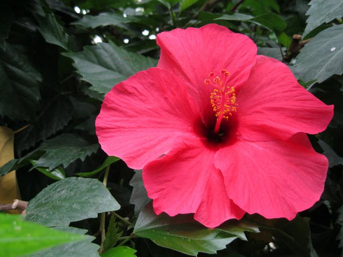 Keywords: hibiscus blossom bloom marshmallow flower plant mallow red stamens exotic macro close