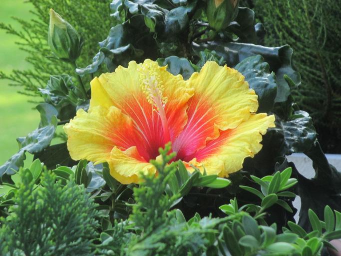 Keywords: hibiscus flower blossom bloom yellow orange ornamental plant