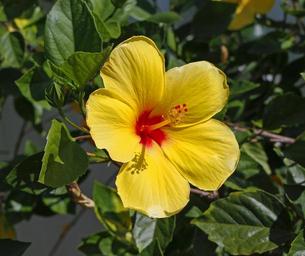 Keywords: hibiscus flower yellow petals garden stamens leaves red plant nature