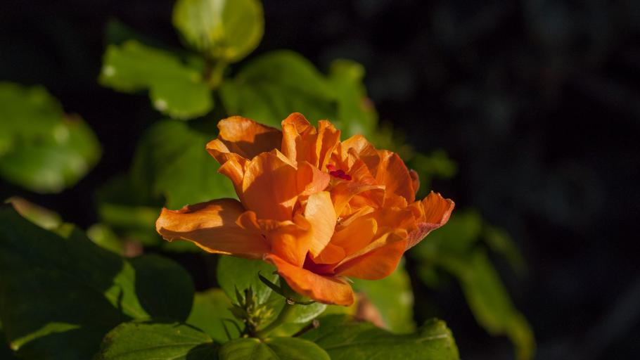 Keywords: hibiscus flowers orange petals blossoms floral multilayered multiple layers tropical flowering plants blooms blooming decorative ornamental gardens gardening green leaves leafy bright colorful sunny day sunlight illuminated nature branches stems shrubs exotic hawaiian