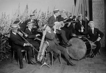 | Keywords: Hickman Orch Action Shot.jpg  Art Hickman His Orchestra Bain News Service photo probably taken on the Orchestra's trip to New York City in 1919 or 1920 Art Hickman at right on drums Per http //www gracyk com/hickman shtml personnel at this time was Steve Douglas violin Walt Roesner trumpet Fred Kaufmann trombone Clyde Doerr alto and baritone saxes oboe and clarinet Bert Ralton soprano and tenor saxes and clarinet Frank Ellis piano Vic King tenor banjo Ben Black plectrum banjo Bela Spiller string bass and Art Hickman drums piano and slide whistle Bain News Service photo labeled only Hickman Via Library of Congress website http //www loc gov/pictures/item/ggb2006006090/; high res TIF border cropped contrast adjusted and converted to jpg before uploading to Wikimedia Commons Not dated probably 1919 or 1920 Uncredited photographer for Bain News Service PD-Bain Art Hickman Musical groups from California Music in 1919 Straw boaters |