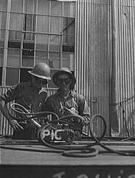 | Keywords: HiggensSteelCuttersGoggles.jpg World War II shipyard work in New Orleans Men who operate automatic steel cutters at the Higgins shipyards New Orleans Louisiana Photograph by John Vachon United States Office of War Information Overseas Picture Division Washington Division via Library of Congress site at http //lcweb2 loc gov/cgi-bin/query/h pp/PPALL field NUMBER+ band fsa+8d39923 Slightly cropped before upload to remove non-photographic border 1943-06 Creator John Vachon PD-USGov 1943 in New Orleans Welding goggles John Vachon World War II home front in the United States Men at work in New Orleans Higgins shipyards |